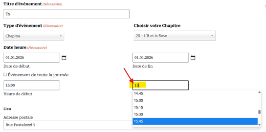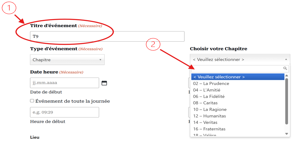 Le Type d’événement nous permet d’associer le code couleur du groupe. Pour les groupes Chapitre, Aréopage et Consistoire, veuillez sélectionner votre Atelier.