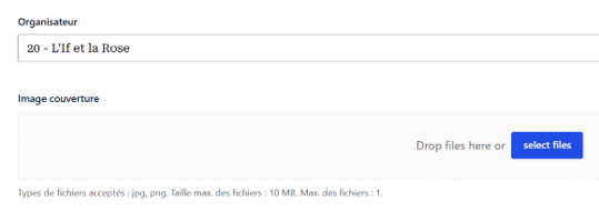 Uniquement dans le formulaire de modification de votre événement, cliquez sur “Select file” ou déposez votre image, et faites votre ajustement.